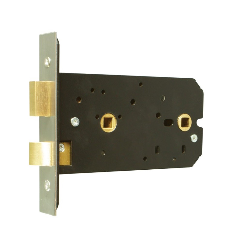 Horizontal bathroom mortice latch for use on internal wooden hinged doors. Fire rated to BS EN 1634-1:2000. Latchbolt operated by knob or lever handle from either side Deadbolt operated by turn from either side. Supplied with striker plate and fixing screws. Finishes stainless steel (SS) or satin brass (SB). Other finishes available.