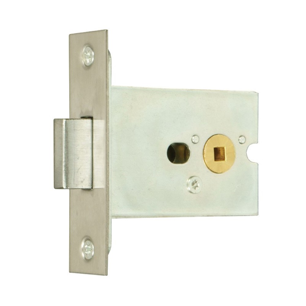 Cubicle lock for use on internal wooden hinged doors. To suit 5mm square spindle. Deadbolt operated by turn from either side. Supplied with striker plate and fixing screws. Finishes stainless steel (SS) or satin brass (SB). Other finishes available. Forend supplied 25mm square as standard.