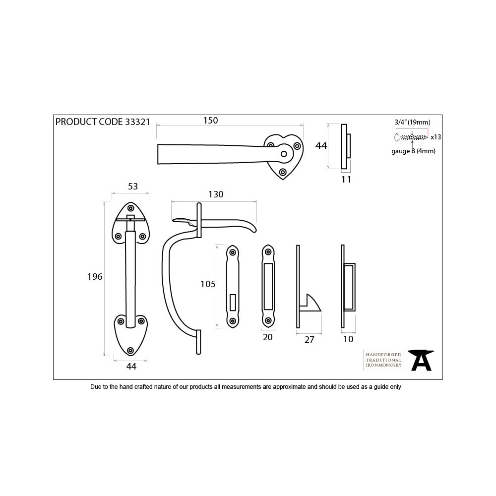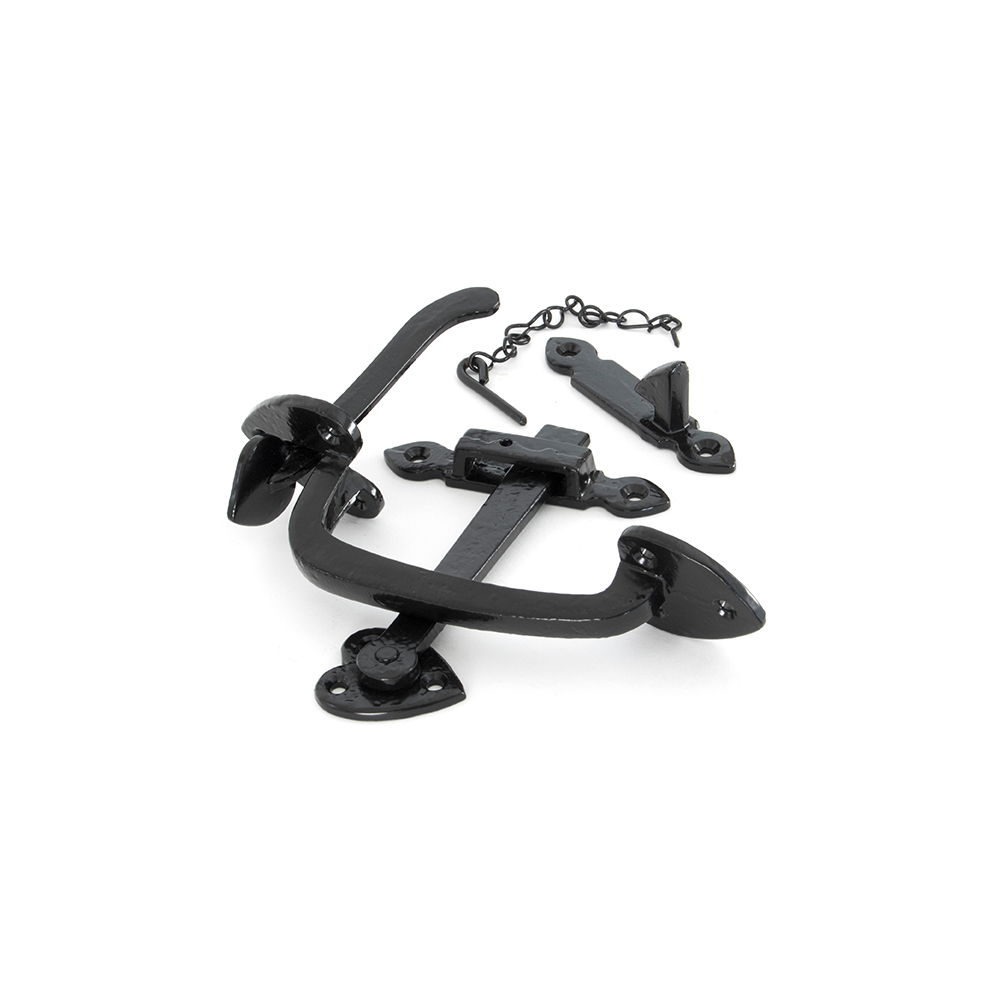 Traditionally used on a ledge and braced door, a thumb latch set is a decorative door latch with a thumb shaped lever. When the thumb shaped lever is pressed down this operates a thumb bar which passes through the door, this lifts the latch bar on the opposite side causing it to open.