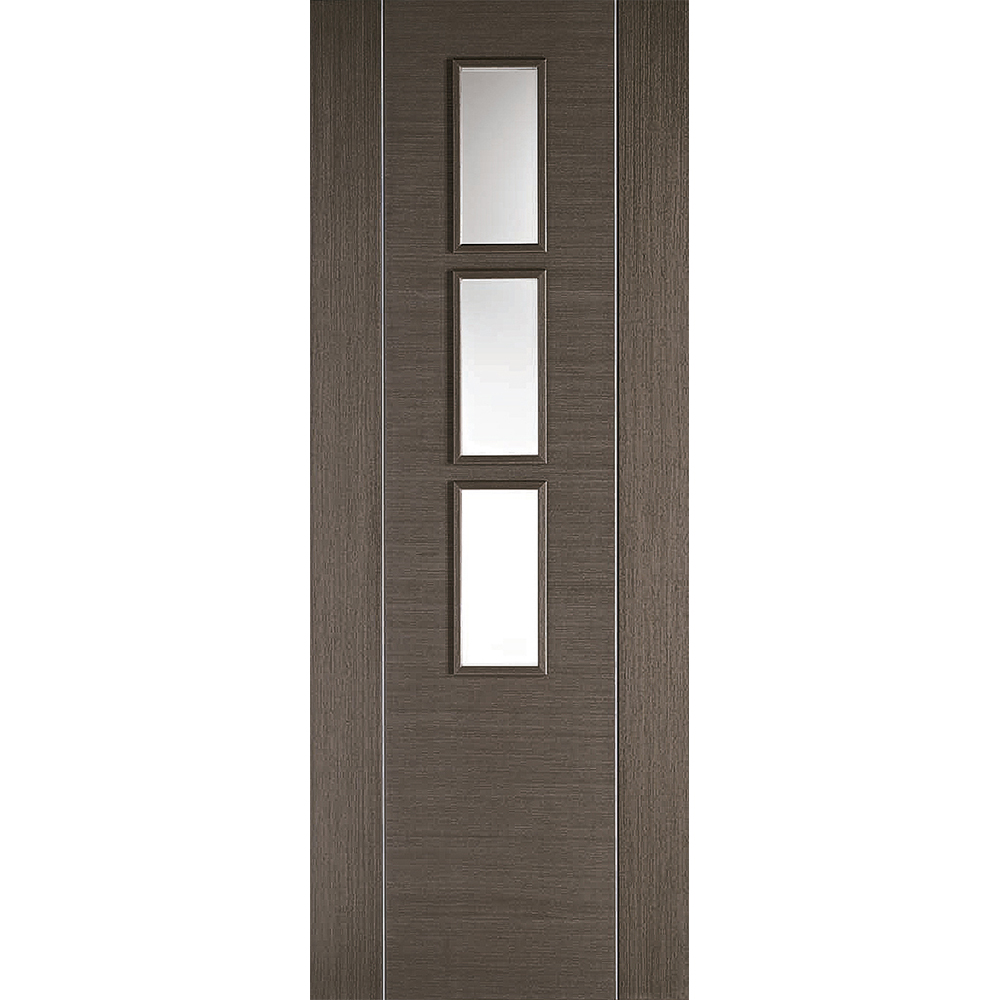 Three clear glazed panels are framed by decorative vertical bars and a pre-finished Chocolate Grey wood grain.