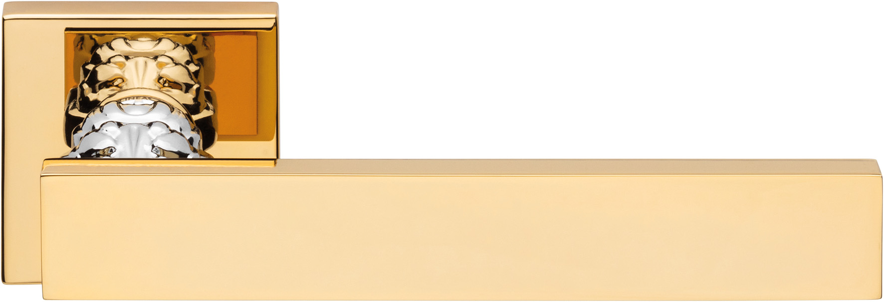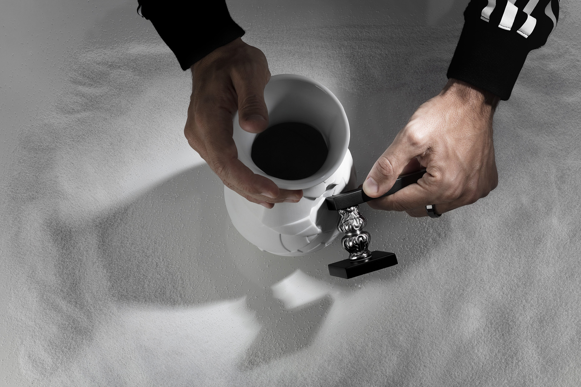 The minimalist and simple rose and handgrip are in contrast to the exuberant stem, rich in friezes worthy of the best cabinetmakers of the past, in a perfectly formal and stylistic dimensional balance.