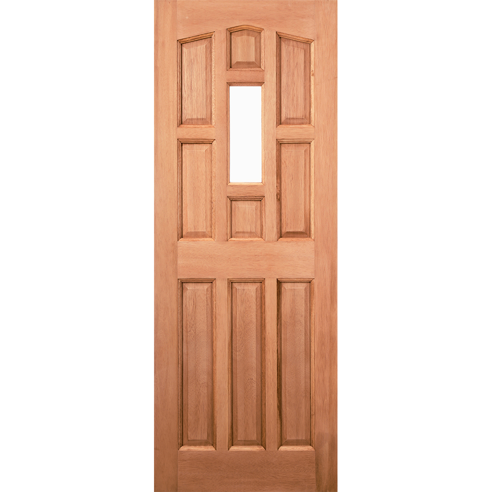 This classic York door design is crafted from hardwood and features various raised shaped panels with an unglazed panel.