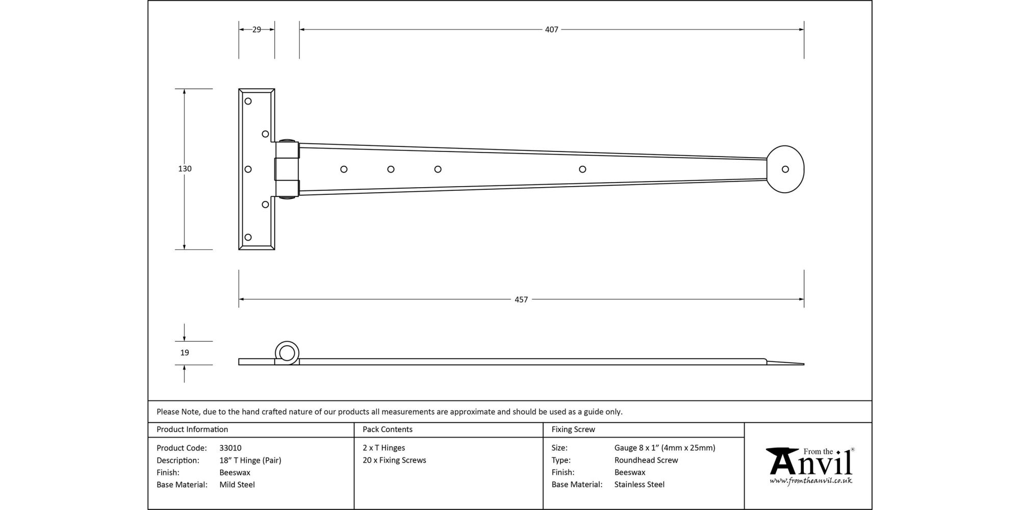 18″ Hinge – Overall Length: 457mm, Hinge Arm: 407mm, Fixing Plate: 130 x 29mm