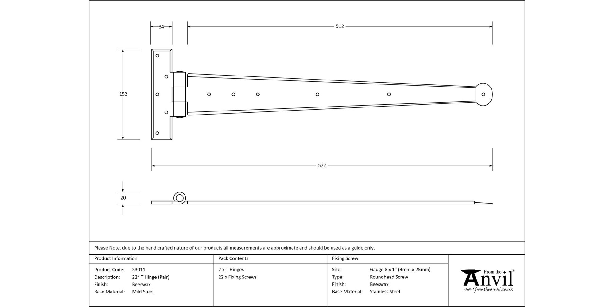 22″ Hinge – Overall Length: 560mm, Hinge Arm: 508mm, Fixing Plate: 152 x 38mm