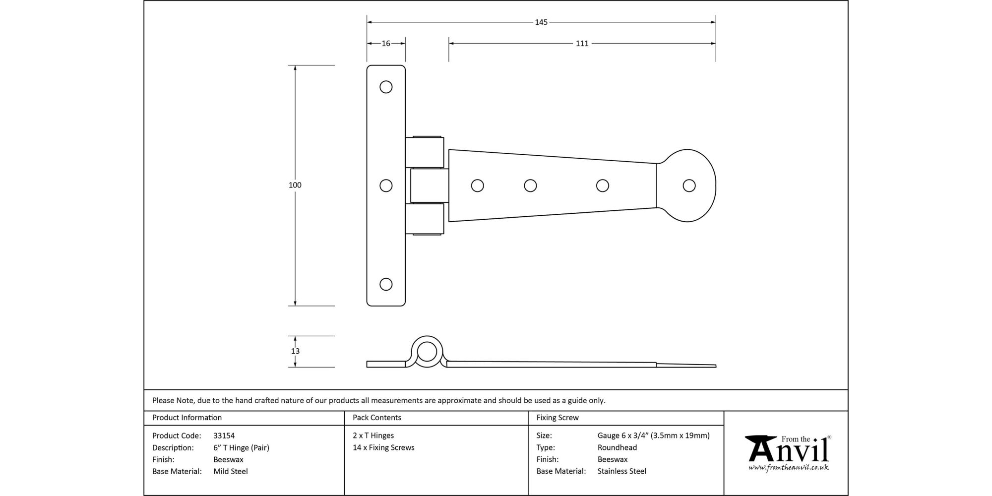 6″ Hinge – Overall Length: 152mm, Hinge Arm: 110mm, Fixing Plate: 102 x 16mm