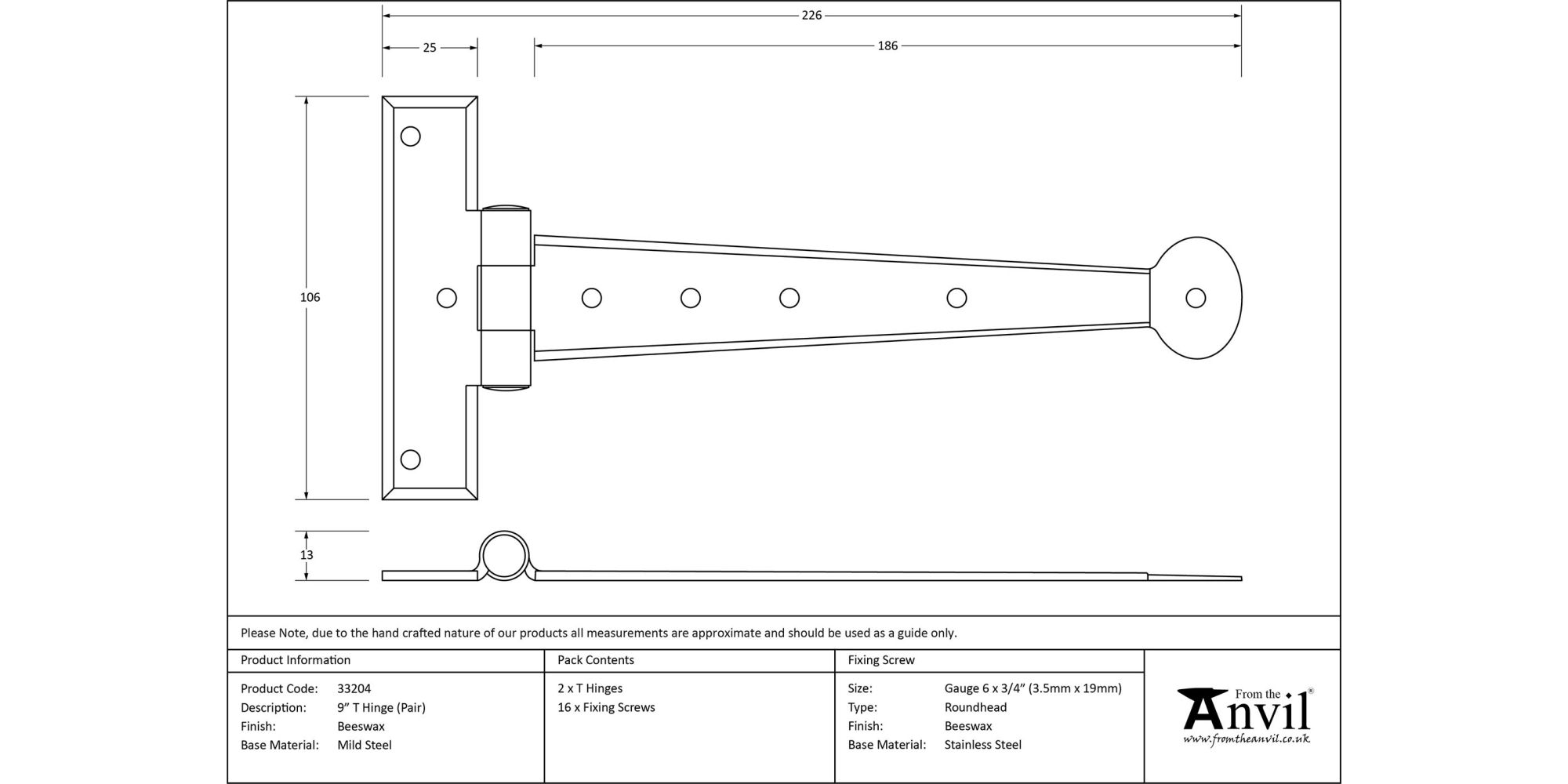 9″ Hinge – Overall Length: 228mm, Hinge Arm: 182mm, Fixing Plate: 106 x 25mm