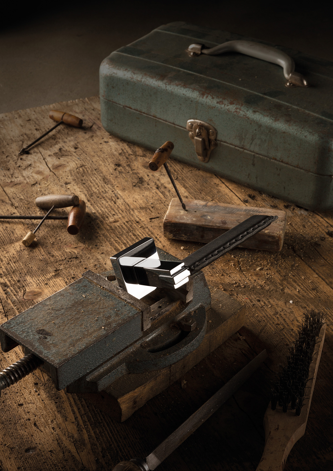 A combination of diverse forms and volumes with a particularly modern flavour is given a classical touch thanks to the handgrip in real Italian leather, a natural expression of the artistic handcrafting of leather.
